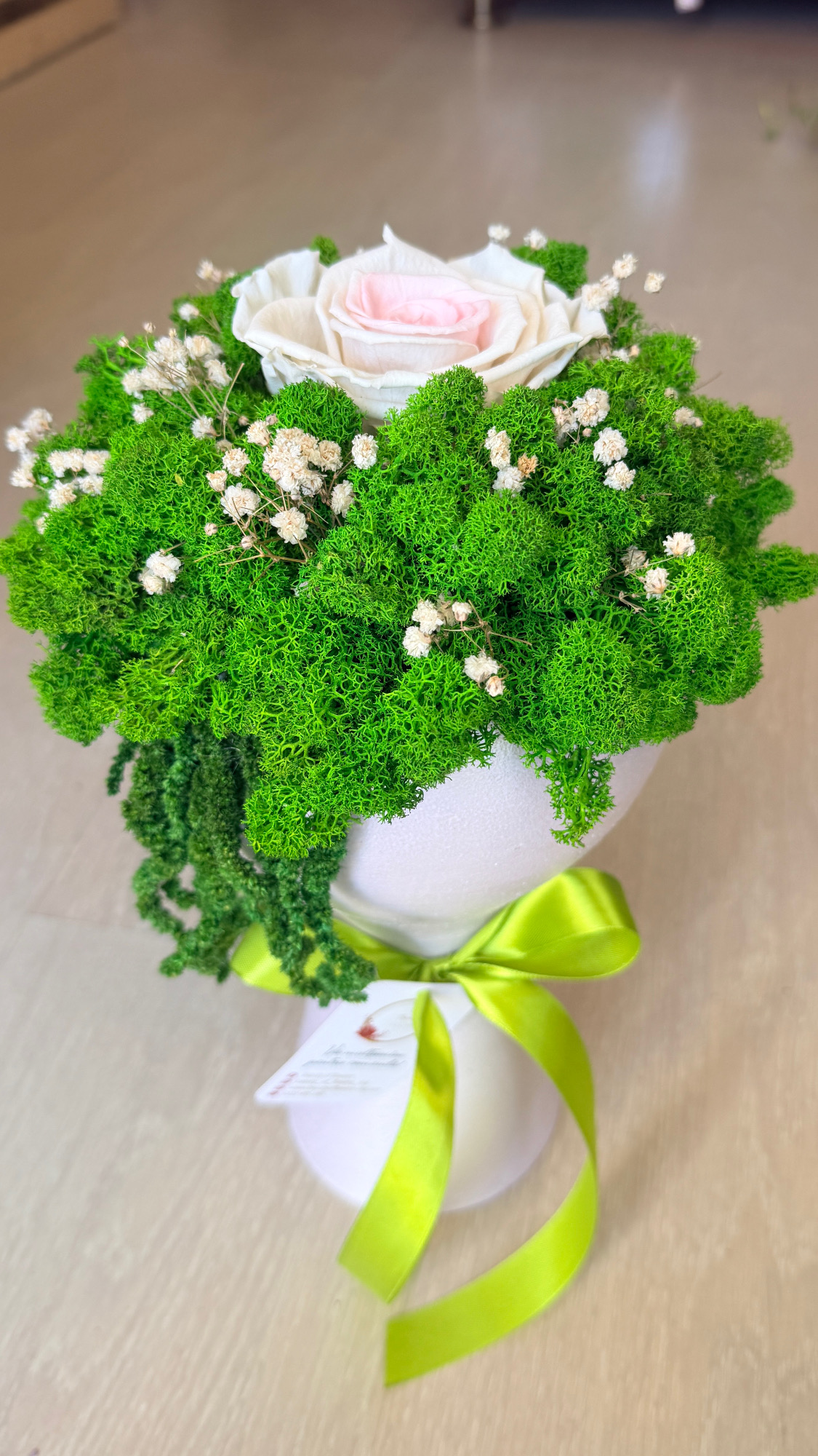 Vaza ceramica decorata cu licheni naturali si trandafir criogenta. inaltime 25 cm